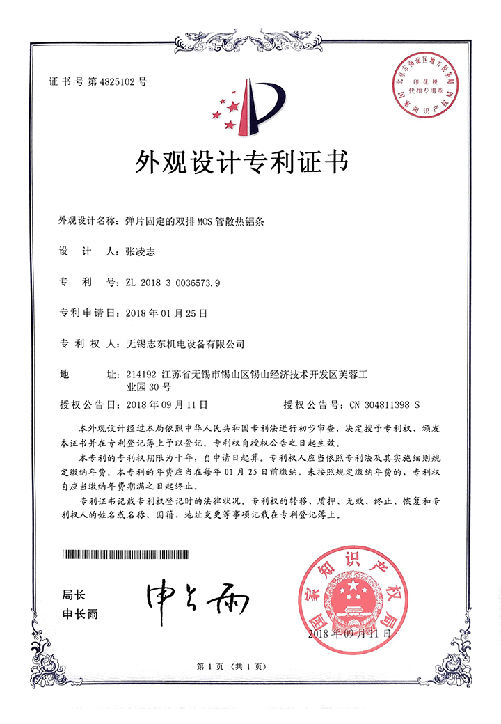 当前位置:首页>>关于志东>>资质证书>>弹片固定的双排MOS管散热铝条